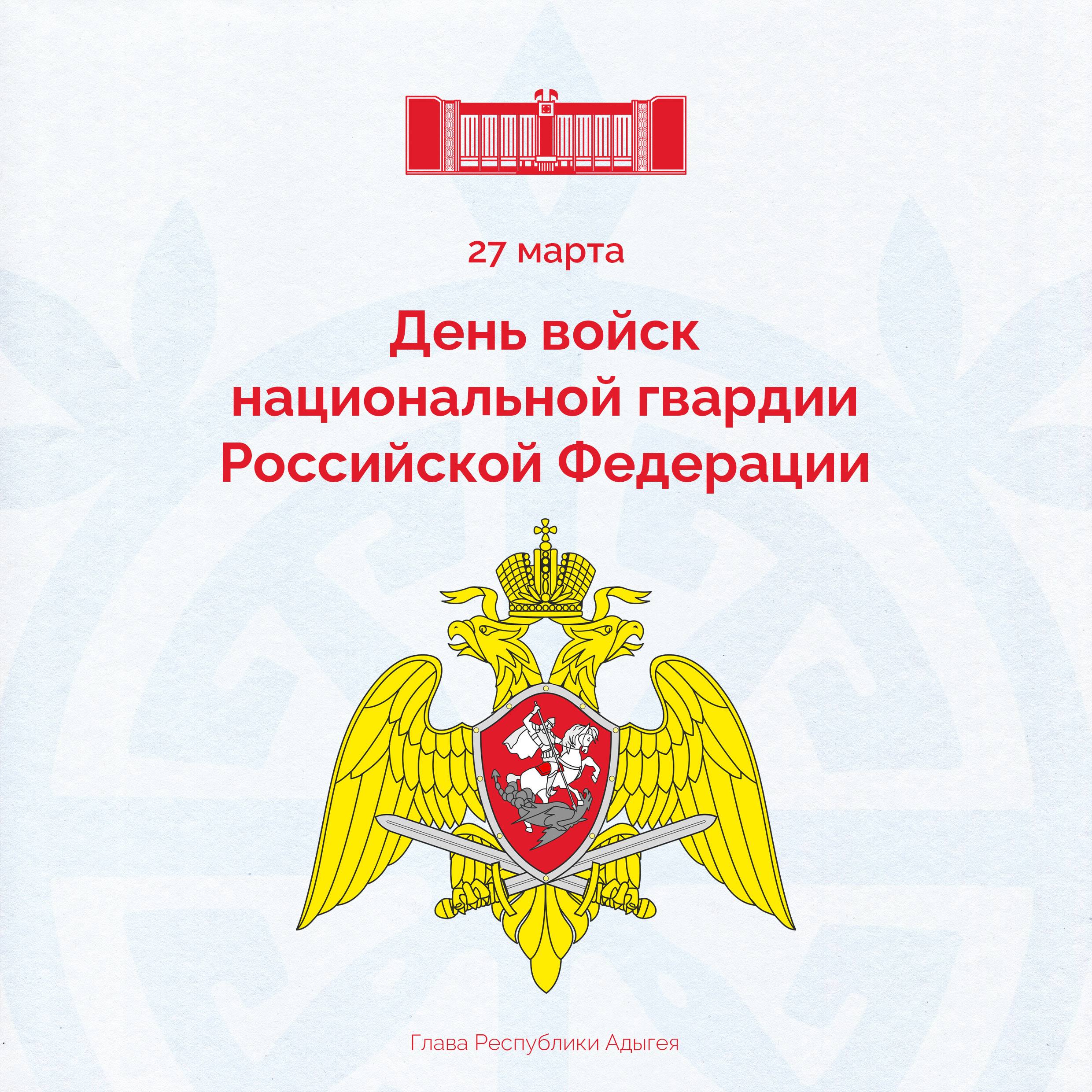 Уважаемые сотрудники национальной гвардии России! Поздравляю вас с профессиональным праздником, а также 215-й годовщиной образования в России войск правопорядка и 10-летием образования войск национальной гвардии Российской Федерации!