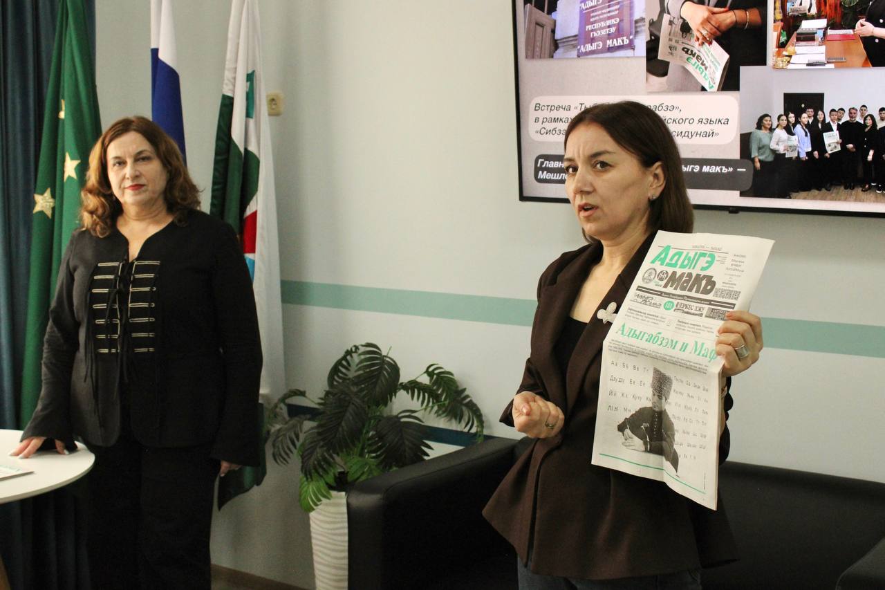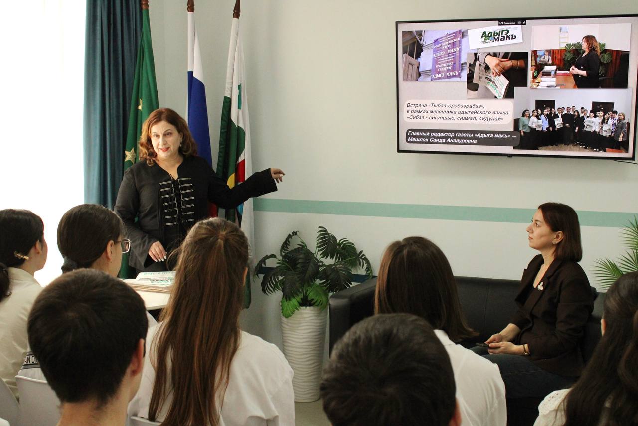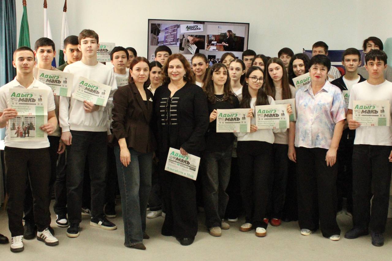 Сегодня в рамках проекта «Тыбзэ-орэбзэрабзэ», к ученикам 9 «Г» (кл.рук. Хабаху С.Г.) пришли главный редактор газеты «Адыгэ макъ» Мешлок С.А. и шеф-редактор газеты Анчокова И.Б., чтобы поделиться своим опытом и рассказать ребятам о значимости родного языка.