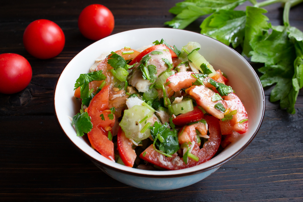 Нарезать вареную курицу произвольно. Стебли сельдерея нарезать кружочками, а помидоры — полукружьями. Свежую кинзу мелко нарезать, а чеснок измельчить через пресс. Все ингредиенты заправляем оливковым маслом, добавляем соль по вкусу и тщательно перемешиваем. Салат готов к подаче!