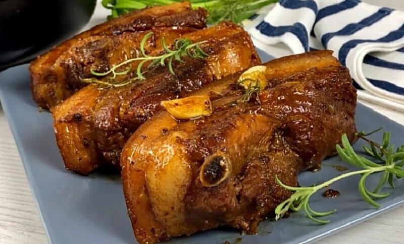 В отдельной миске смешиваем соевый соус, сахар и молотую паприку. Если используется копченая паприка, готовое блюдо приобретет ощутимый аромат шашлыка. Полученный соус равномерно распределяется по мясу в сковороде, добавляются пажитник и розмарин, а затем накрывается крышкой для тушения в течение двух часов. В процессе рекомендуется переворачивать грудинку 2-3 раза для равномерного приготовления.