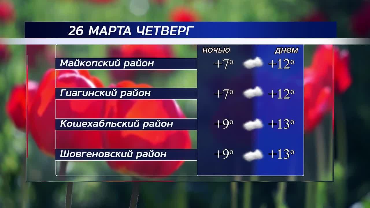 Доброе утро!26 марта в Адыгее солнечная погода.Порывы ветра: до 3 м/с.Майкоп | Мыекъуапэ +17Адыгейск | Адыгэкъалэ +17Гиагинский район | Джэджэ район +16Кошехабльский район | Кощхьэблэ район +17Шовгеновский район | Шэуджэн район...