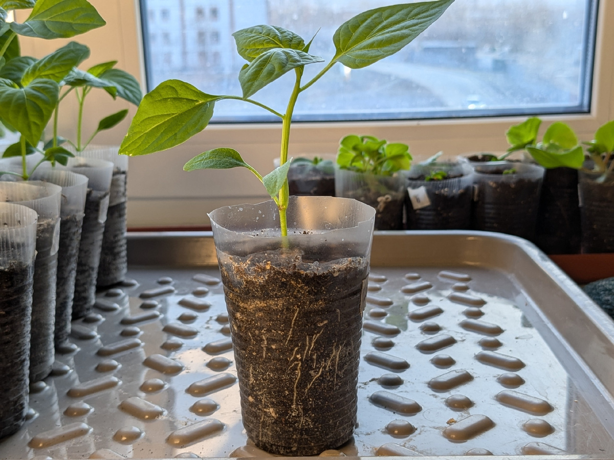 Неожиданный шаг: автор отказался от подкормки рассады, посеянной в марте. Условия пересадки в свежий грунт и более крупные ёмкости должны обеспечить растения всем необходимым для роста.