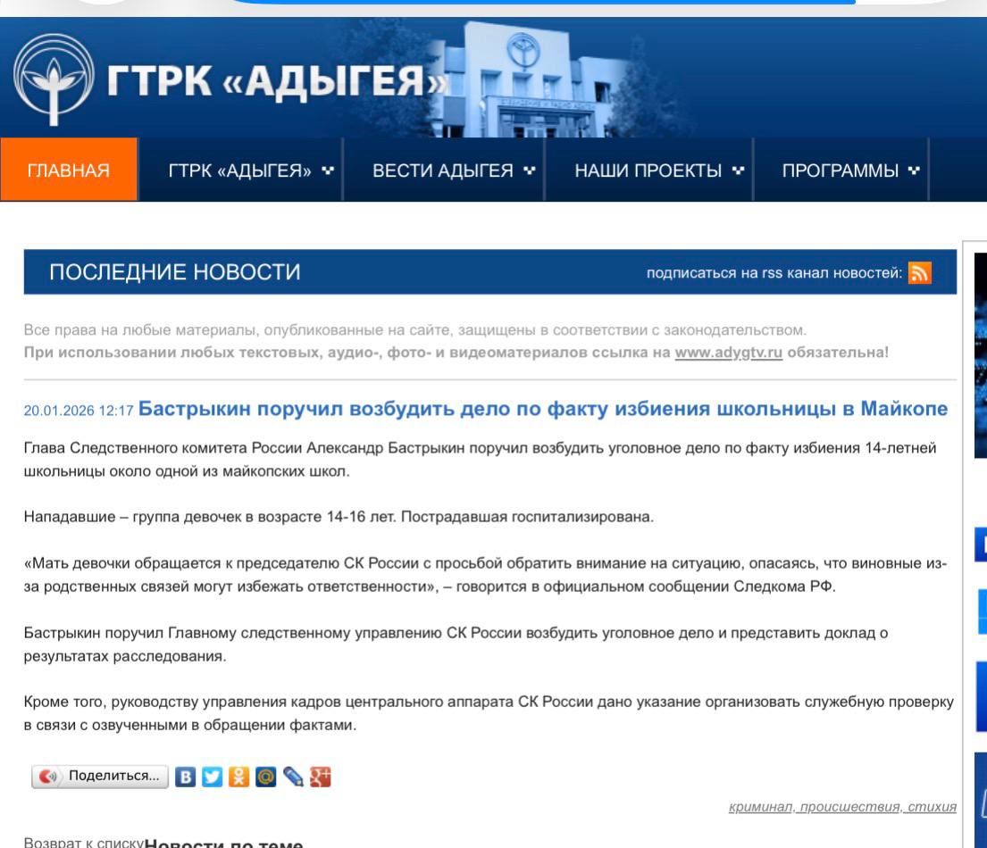 Вчера в Майкопе толпа подростков избила 13-летнюю школьницу возле многоквартирного дома. Девочку избивали больше часа, ставили на колени и заставляли извиняться. Как сообщают СМИ, полиция уже проводит проверку, а прокуратура взяла ход проверки на контроль.