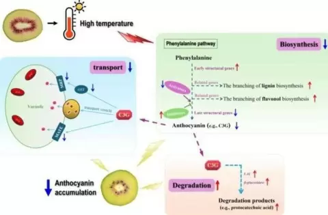 Согласно полученным данным, температуры в диапазоне 25–40 °C приводят к активному разложению антоцианов, что сокращает их содержание и ухудшает качество киви. Увеличение температуры инициировало накопление продуктов разложения, таких как протокатеховая кислота, и активизацию генов, ответственных за метаболизм. Это исследование предоставляет первый полный обзор механизмов биосинтеза и деградации антоцианов в живой ткани киви.