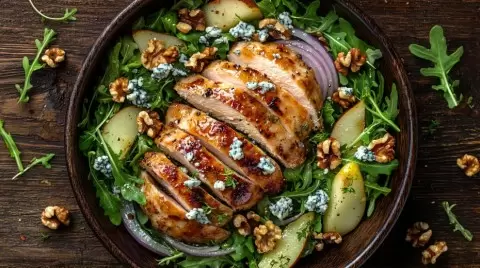 Теперь собираем салат. На большое блюдо выкладываем свежую руколу, затем равномерно раскладываем куриные ломтики, кусочки груши и полукольца красного лука. Посыпаем раскрошенным голубым сыром и орехами. Перед подачей поливаем салат приготовленным соусом.