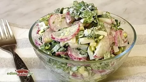 Редис следует очистить, срезая ботву и хвостики. Нарезать его можно кружочками или половинками кружочков. Яйца нарезать кубиками или на четвертинки — это зависит от ваших предпочтений. Все ингредиенты необходимо аккуратно объединить в салатнице. Добавьте щепотку соли и перемешайте.