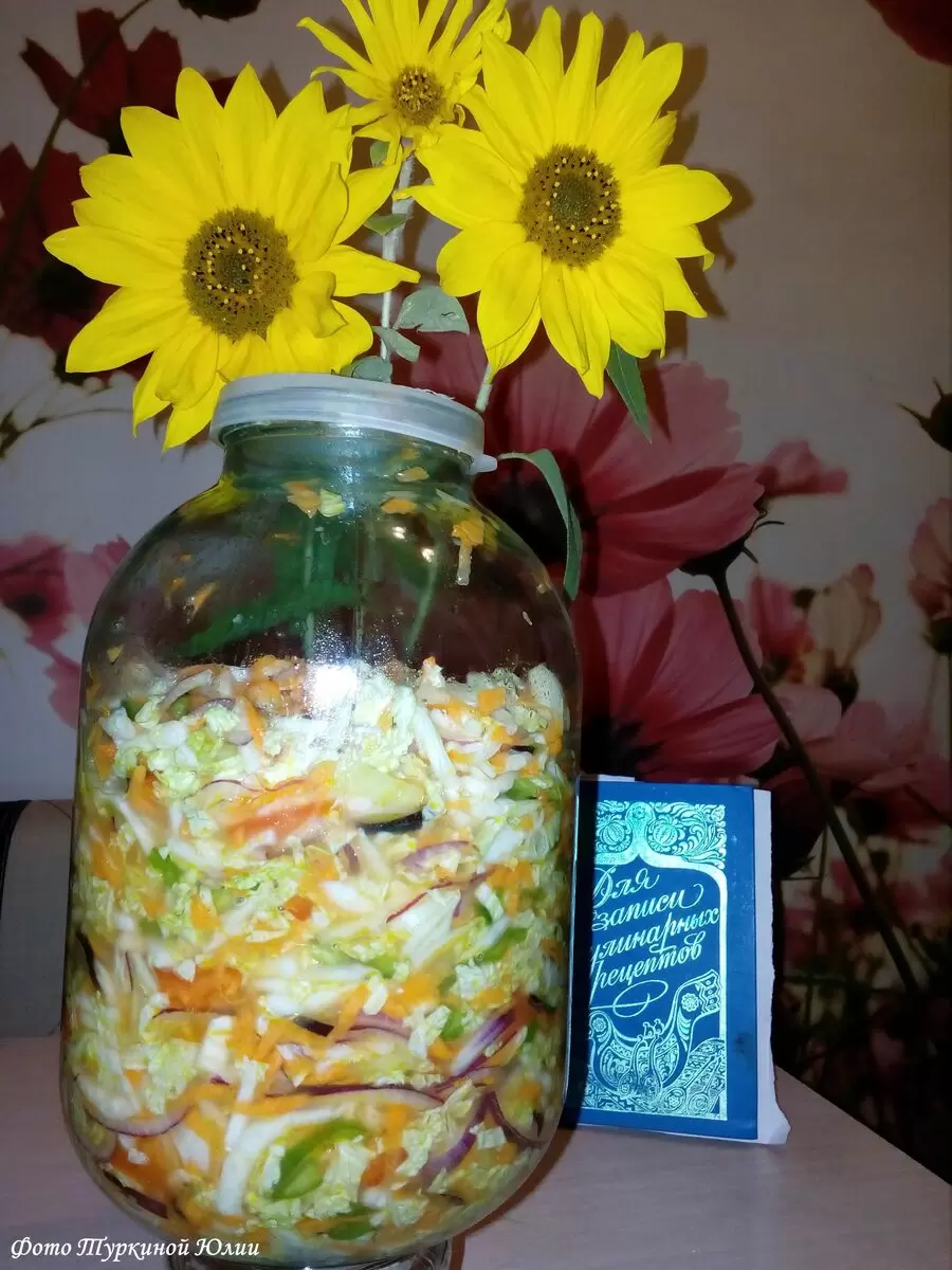 Готовый салат осторожно раскладывают по заранее обработанным и стерилизованным банкам. После этого его можно хранить в холодильнике, где он сохранит свой неповторимый вкус на протяжении длительного времени.