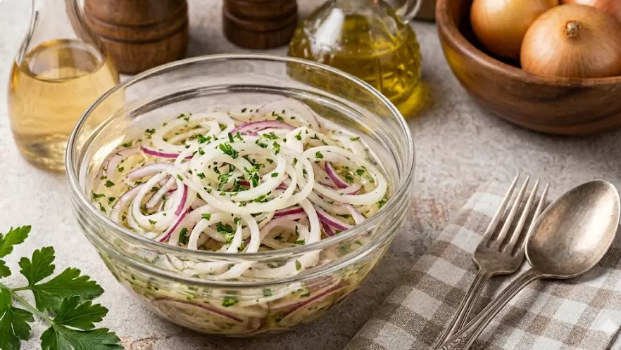 Этот луковый салат — наглядный пример того, как из банальных ингредиентов можно создать настоящий кулинарный шедевр. Его легкость и аромат, а также яркий вкус сделают его любимым угощением на вашем столе.
