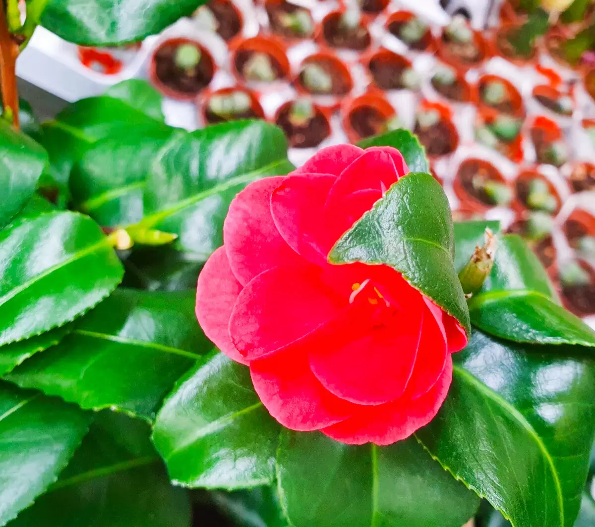 Эти прекрасные растения привезли к 8 марта, но из-за высокой цены многие из них остались непроданными. Однако сейчас камелии раскрыл свои великолепные цветы, украшенные ярко-зелеными листьями. Цена на них пока не изменилась и составляет 1100 рублей. Хотя многие говорят, что камелия — капризный цветок, она смогла пережить даже худшие условия в магазине и сейчас радует глаз.
