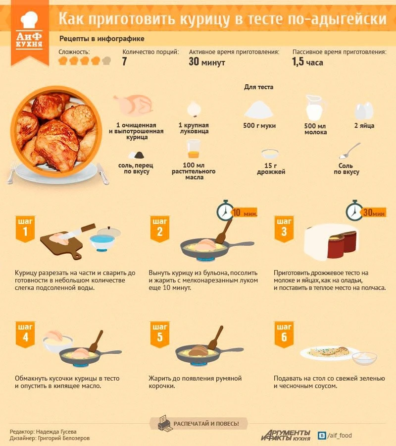 Адыги готовят это блюдо на праздничный стол. Подают курицу в тесте с чесночным соусом и свежей зеленью.