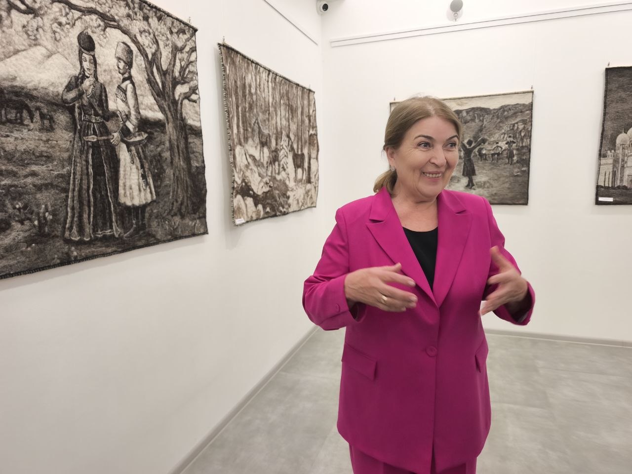 В Картинной галерее РА открылась выставка Сасы Мещезовой «Войлочные истории». Представила 20 работ сама автор — художник из Карачаево-Черкесии. Картины из овечьей шерсти она создает уже более 25 лет.
