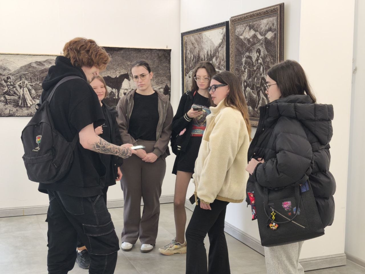 Картины изображают героев нартского эпоса, пейзажи и передают движения национального танца. Экспозиция продлится до 10 мая.