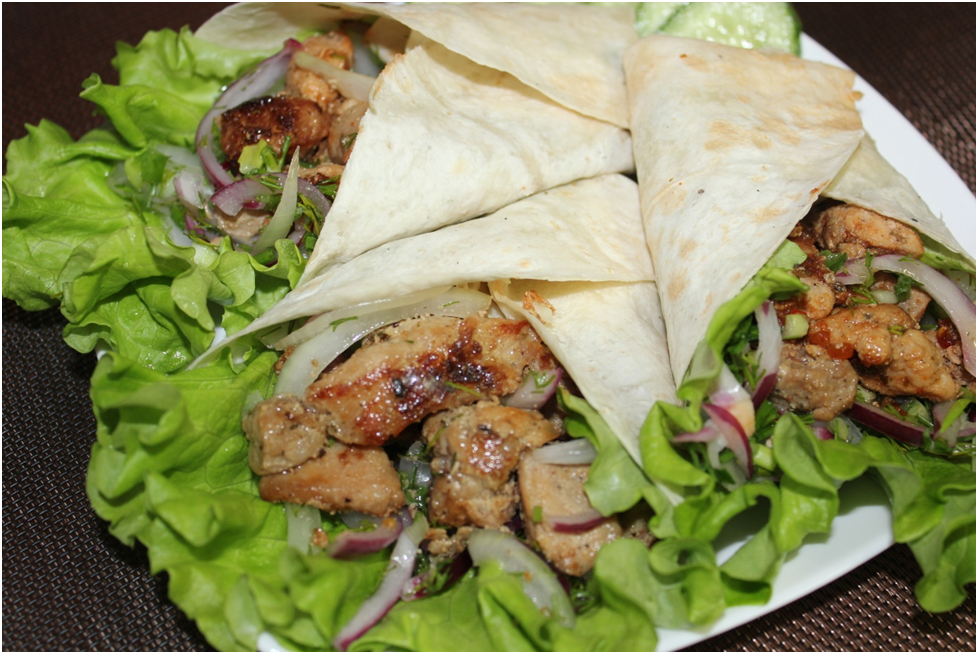 Готовое мясо подается в лаваше, добавляя маринованный лук и соус. Это удивительное сочетание точно не уступит шашлыку, приготовленному на мангале!