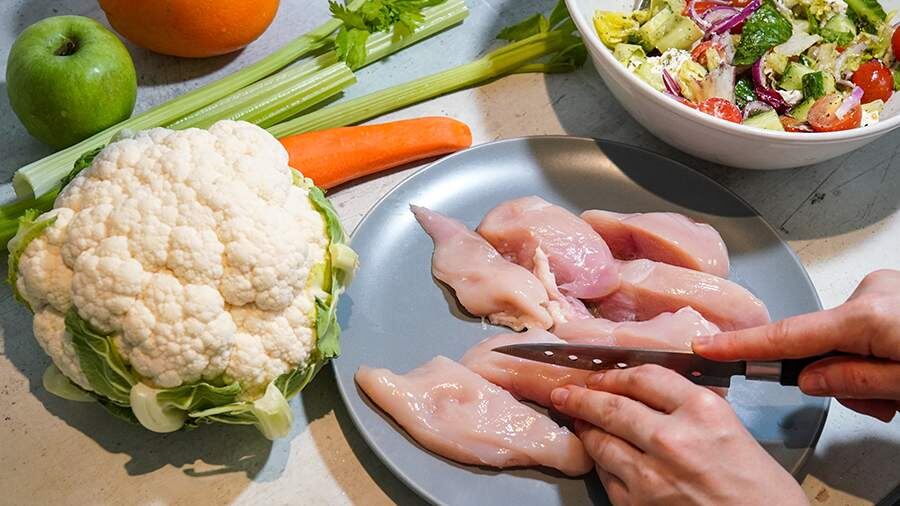 Для завтрака он рекомендует овсянку на молоке, вареные яйца и яблоко. Обед может состоять из гречки, тушеной куриную голень или бедра с салатом из капусты и моркови. В качестве перекуса подойдут черный хлеб в виде сухариков и кефир. На ужин можно приготовить тушеную капусту с курицей. Более того, нутрициолог советует включить в рацион фасоль и творог.