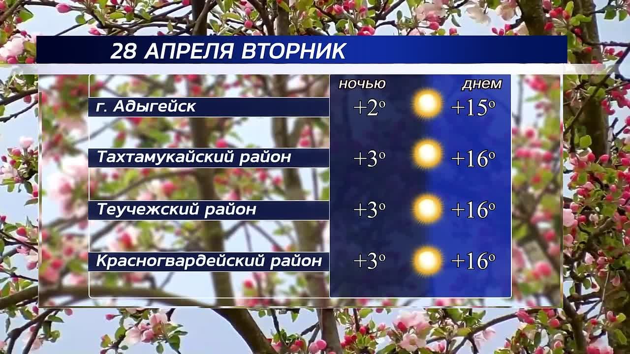 Доброе утро!28 апреля в Адыгее ясно, без осадков.Порывы ветра: до 12 м/с.Майкоп | Мыекъуапэ +13Адыгейск | Адыгэкъалэ +14Гиагинский район | Джэджэ район +13Кошехабльский район | Кощхьэблэ район +13Шовгеновский район | Шэуджэн район +13Красногвардейский...