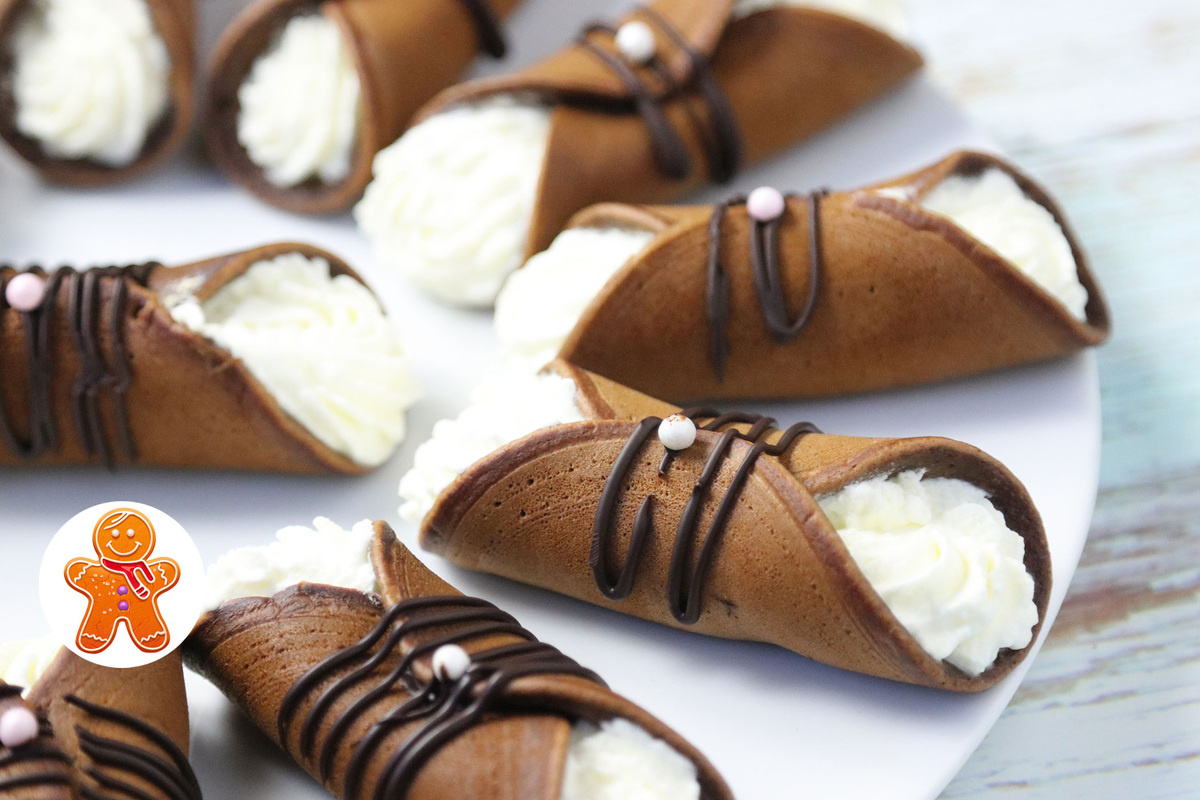Когда все коржи остыли, взбить сливки с сахарной пудрой до устойчивых пиков. С помощью кондитерского мешка или ложки выкладывать начинку на каждый корж, заворачивая их, как мешочек, и скрепляя края зубочистками или пищевой пленкой. Убрать в холодильник на 40 минут для фиксации формы.